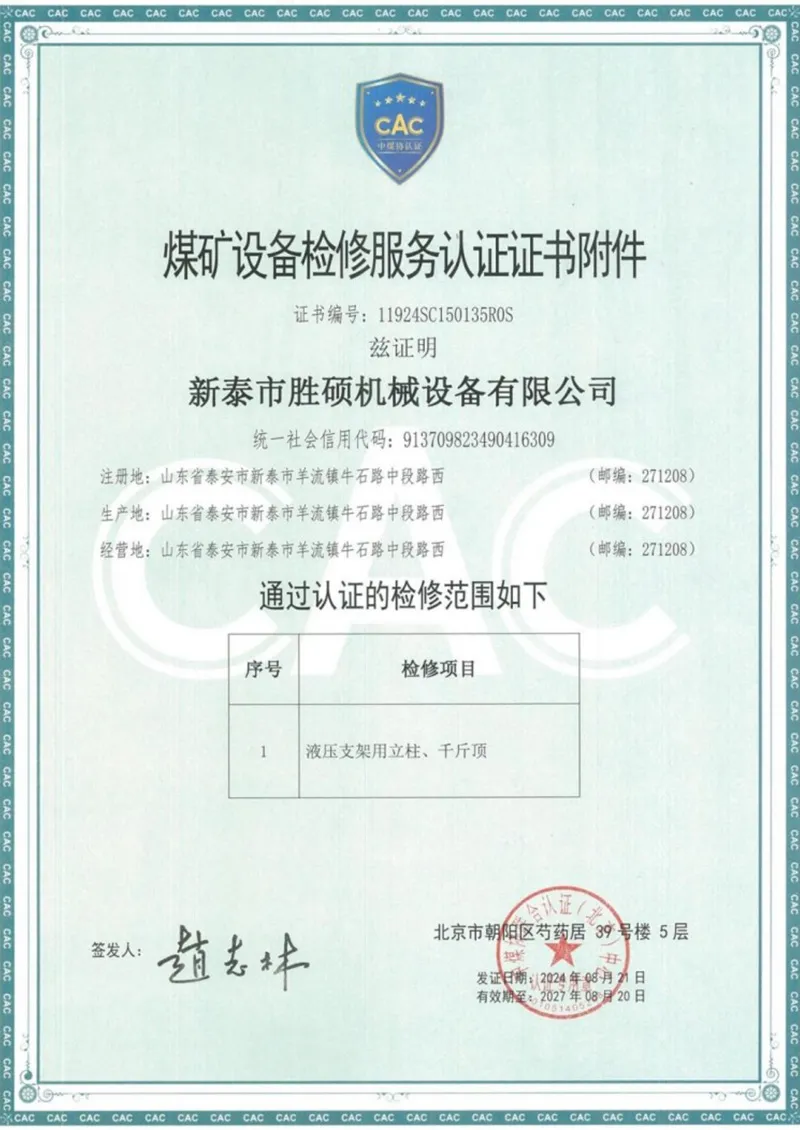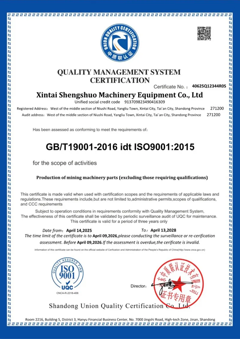 В целях укрепления управления качеством и повышения стандартов качества в ООО «Синьтай Шэншо Машиностроительное Оборудование» были разработаны специальные процедуры управления качеством продукции и меры по обеспечению качества, адаптированные к условиям деятельности компании. Компания имеет сертификат на обслуживание оборудования для угольных шахт (сертификат № 11924SC150135ROS) и сертификат системы управления качеством (сертификат № 40625Q12344ROS).